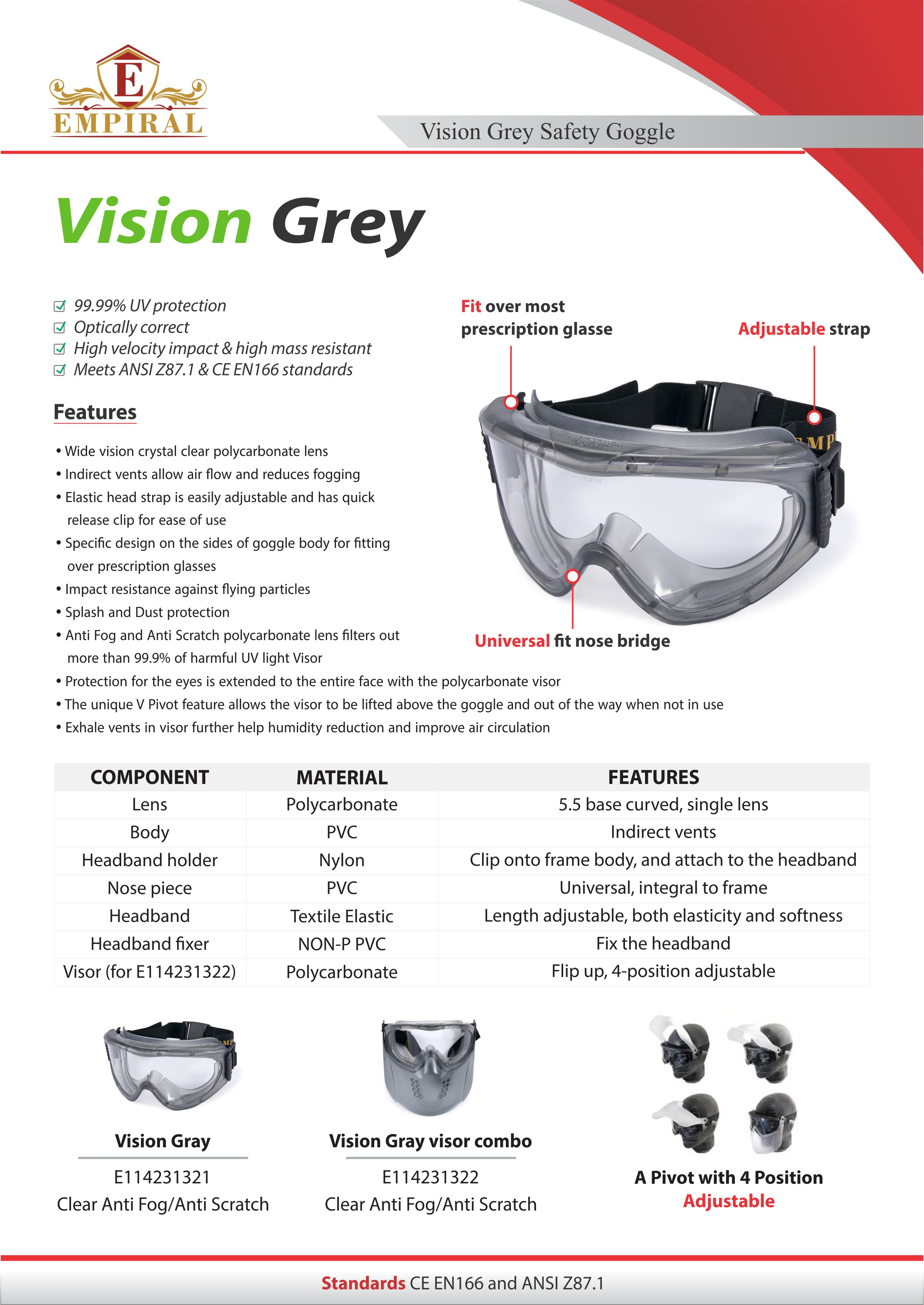 LENS : Polycarbonate Lens protects against Splash and Dust. High velocity and Impact resistance against flying particles.